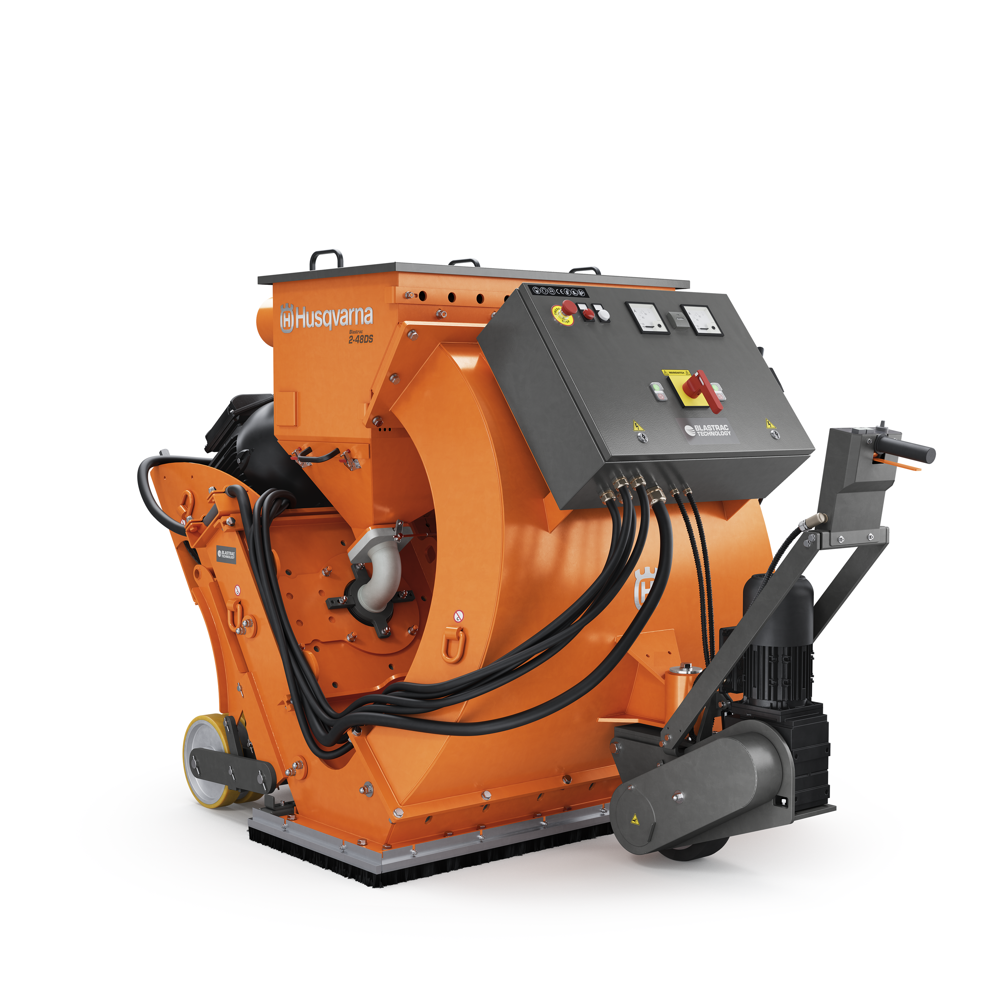 Blastrac 2-48DS is the largest walk-behind shotblasting machine in our range. With two powerful blast motors, it is ideal for large heavy duty work and can be used on different surfaces like concrete, stone, asphalt and steel. Blastrac 2-48DS is equipped with its own height adjusting system for easy transportation. It can be used for floor preparation, renovation, maintenance and decorative purposes. It is also ideal for grip improvements.